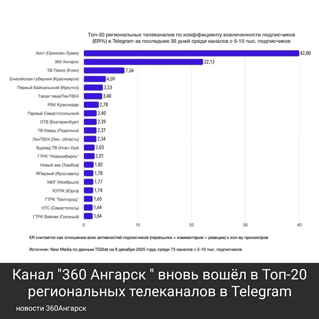 📈🏆С радостью сообщаем, что мы вновь вошли в Топ-20 региональных телеканалов в Telegram за последние 30 дней среди каналов с 5-10K подписчиков!